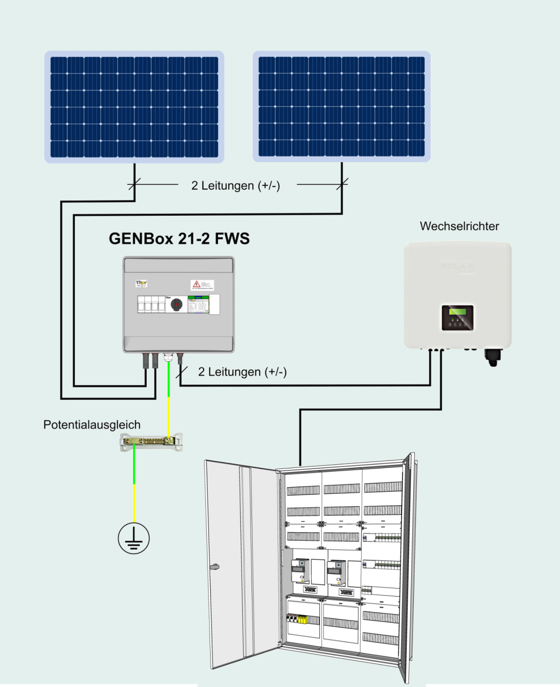 PV-Anlage, 2 Modulstrings, 1 Wechselrichtereingang, GENBox 21-2 FWS mit Feuerwehrschalter. Zählerschrank mit Überschusseinspeisung.
